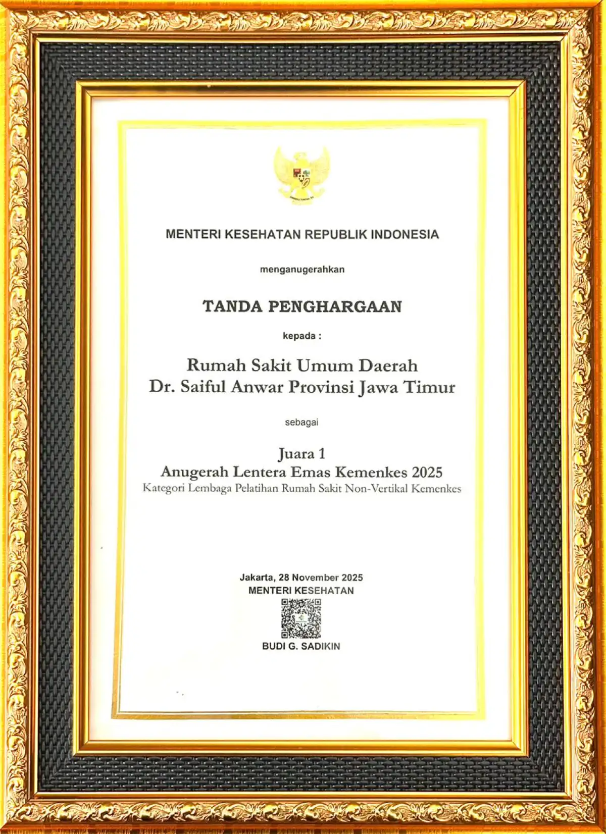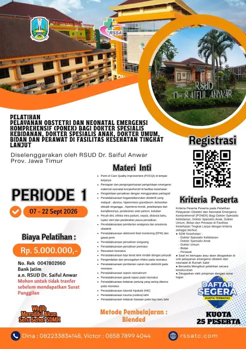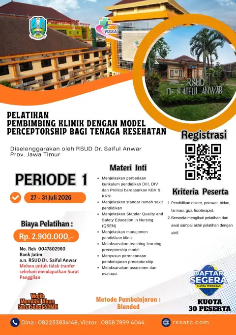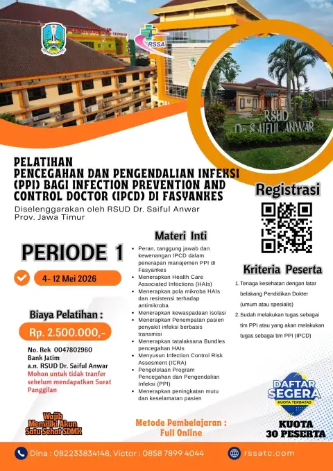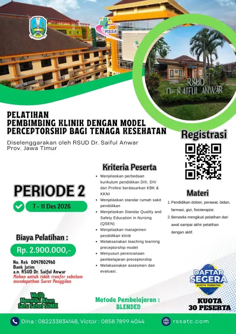 Anda dapat melihat Sertifikat beserta SK RSUD Saiful Anwar sebagai Instusi Penyelenggara Pelatihan Bidang Kesehatan di link berikut : https://bit.ly/SERTIFIKATSKRSSA