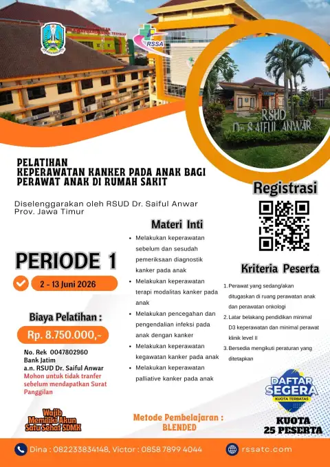 BLENDED27 - 31 Juli 2026PENDAFTARAN AKTIFDetail Pelatihan Keperawatan Kanker pada Anak bagi Perawat Anak di Rumah Sakit, Periode 1PELATIHAN