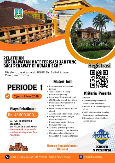 Klasikal12 - 16 Oktober 2026PENDAFTARAN AKTIFDetail Pelatihan Keperawatan Kateterisasi Jantung Bagi Perawat di Rumah SakitPELATIHAN