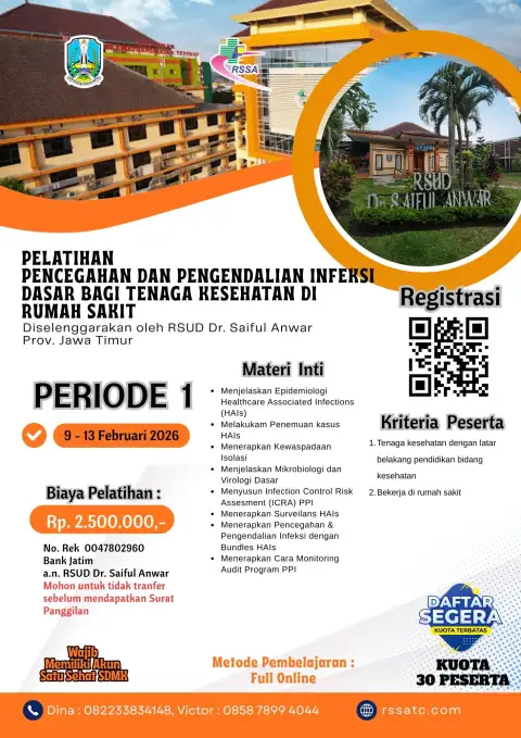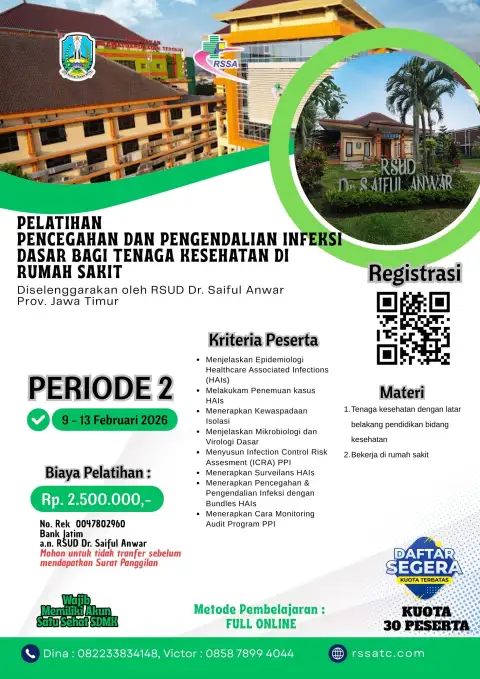ONLINE14 - 19 September 2026PENDAFTARAN AKTIFDetail Pelatihan Pencegahan Dan Pengendalian Infeksi Dasar Bagi Tenaga Kesehatan Di Rumah SakitPELATIHAN